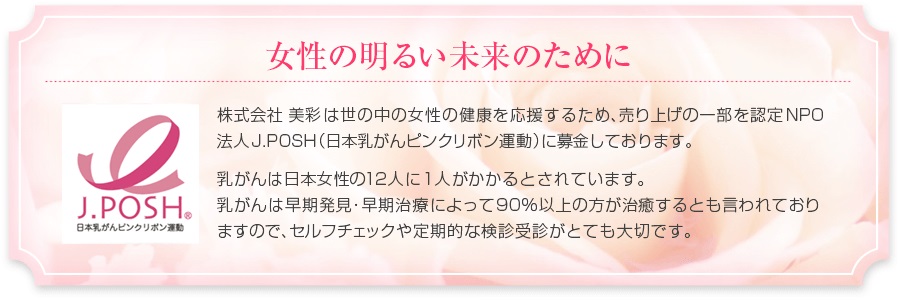 そしてアクアデオを製造・販売している株式会社 美彩は売り上げの一部を認定NPO法人J.POSH(日本乳がんピンクリボン運動)に募金しているので、私達がアクアデオを購入したお金の一部は日本乳がんピンクリボン運動の元に届いているのです。