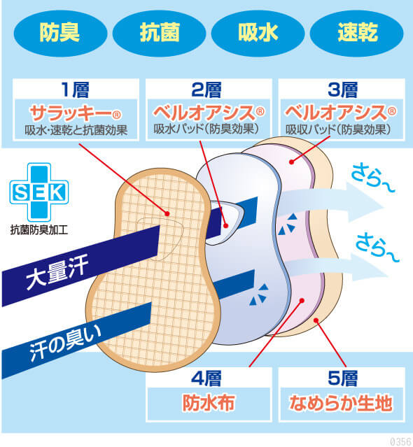 このパットは抗菌防臭加工の5層構造になっていて、汗を大量にかいてもニオイまでしっかりとブロックしてくれる安心設計です。